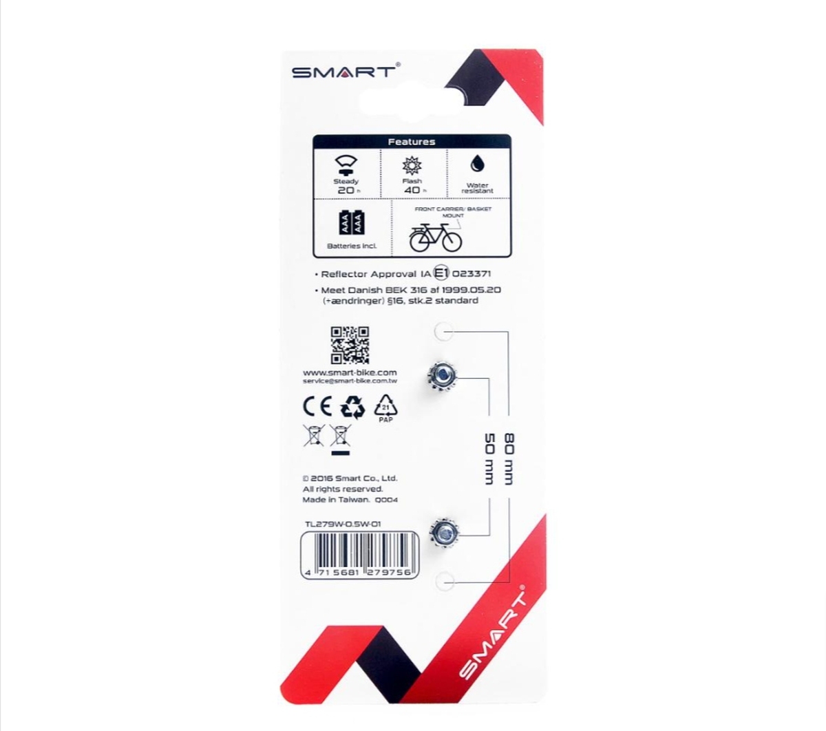 Lygten er godkendt, og har 1×0,5 Watt hvid LED-indikator; men fungerer også optimalt som refleks.